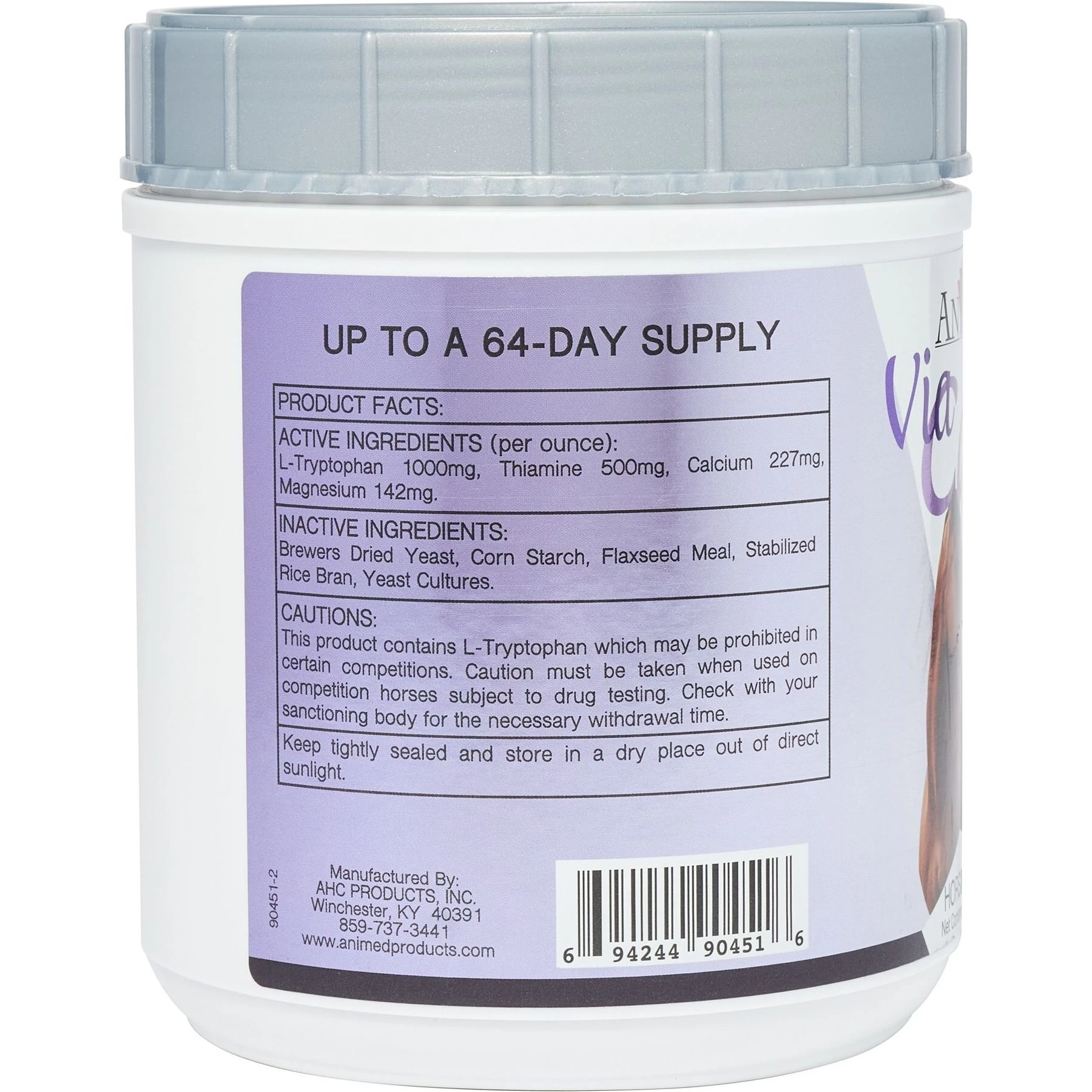 - All-natural supplement made with a host of ingredients including l-tryptophan, thiamine, calcium, magnesium and live yeast cultures to help calm anxious, restless or high strung horses