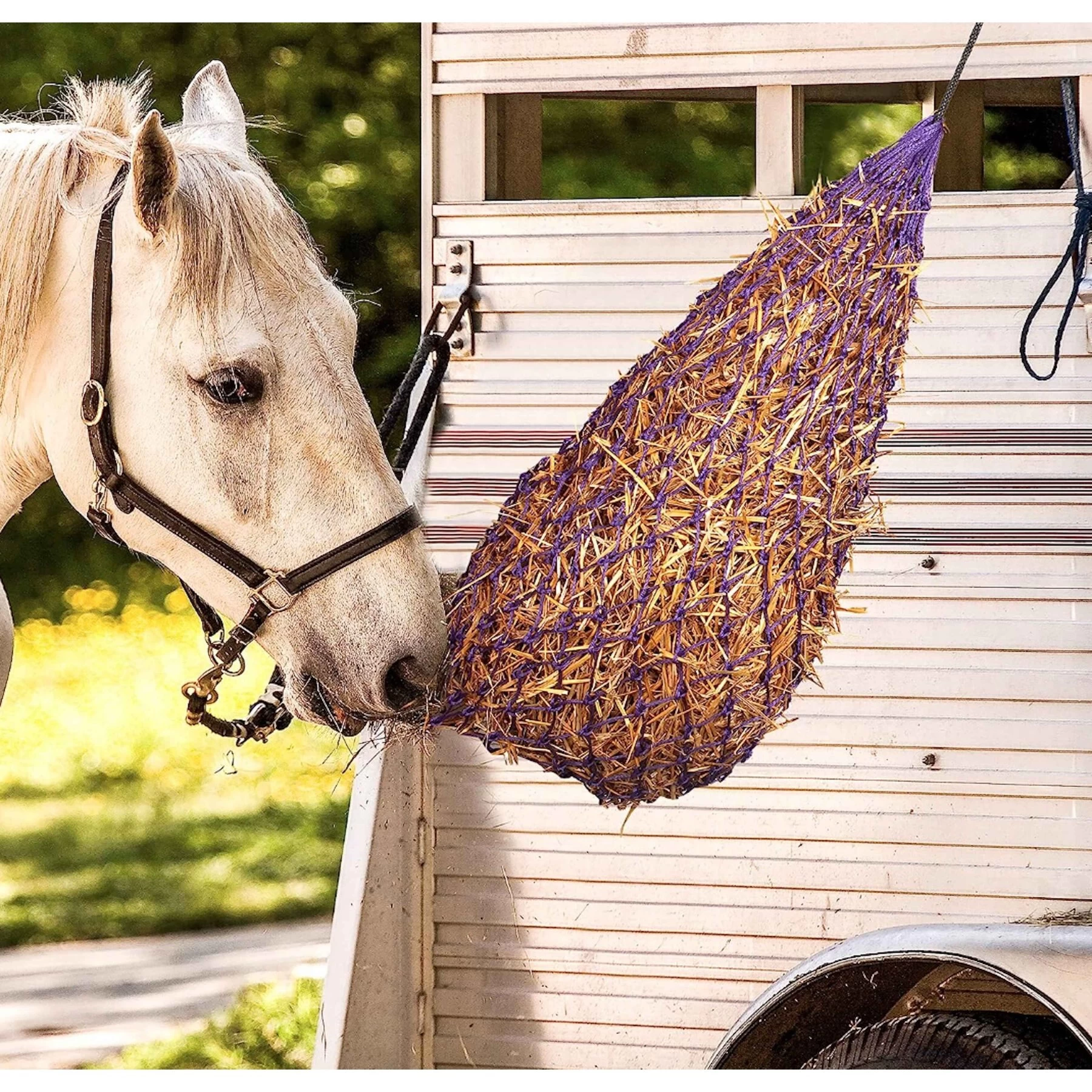 - Holds 3 to 5 flakes of hay, features a strong top rope.
