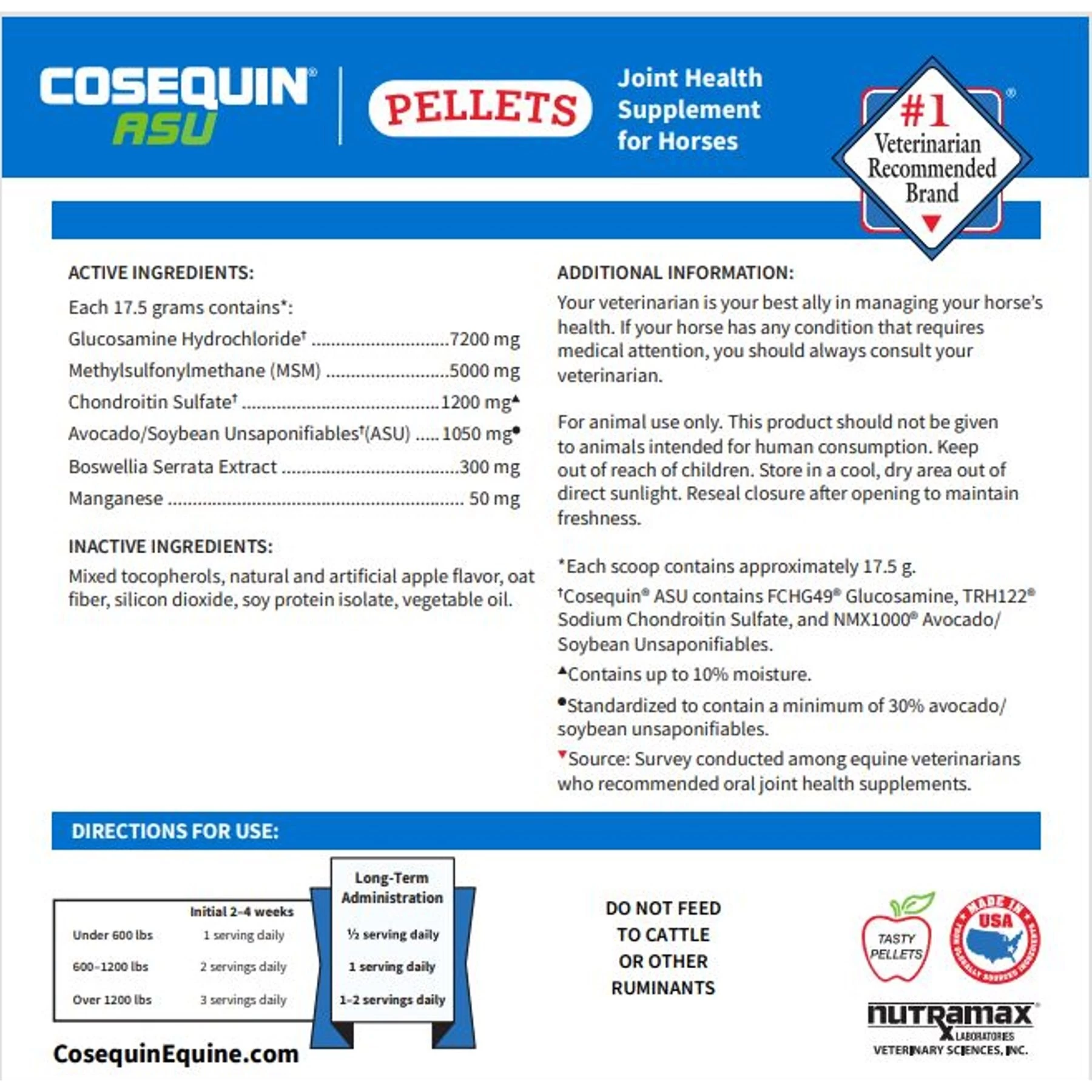 Nutramax Cosequin Pellets With Glucosamine & Chondroitin ASU Joint Health Supplement For Horses, 1420 Grams